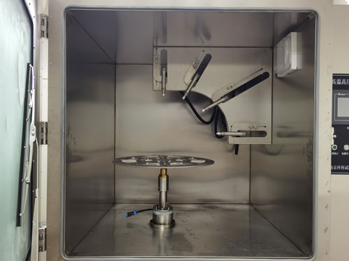 IPX9K级防水等级试验IPX9K级防水等级关键根据高温高压喷淋对试件进行冲击性,来测试机壳的防水特性。依据规范內容要求,要做IPX9K级防水等级检测,必须根据4个喷嘴各自对试品进行高温高压喷淋,每一喷嘴的检测時间为30S;如果是大中型机壳,则最少检测3min。